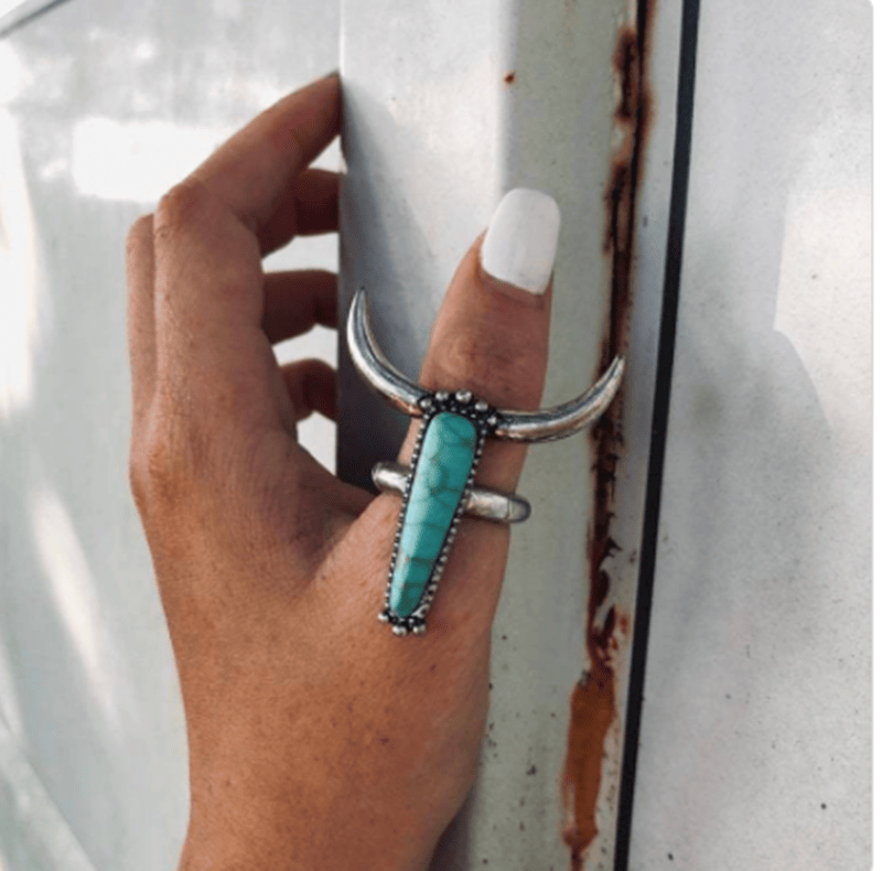 Vintage Thai Silver Turquoise Horn Ring Ox Head Punk